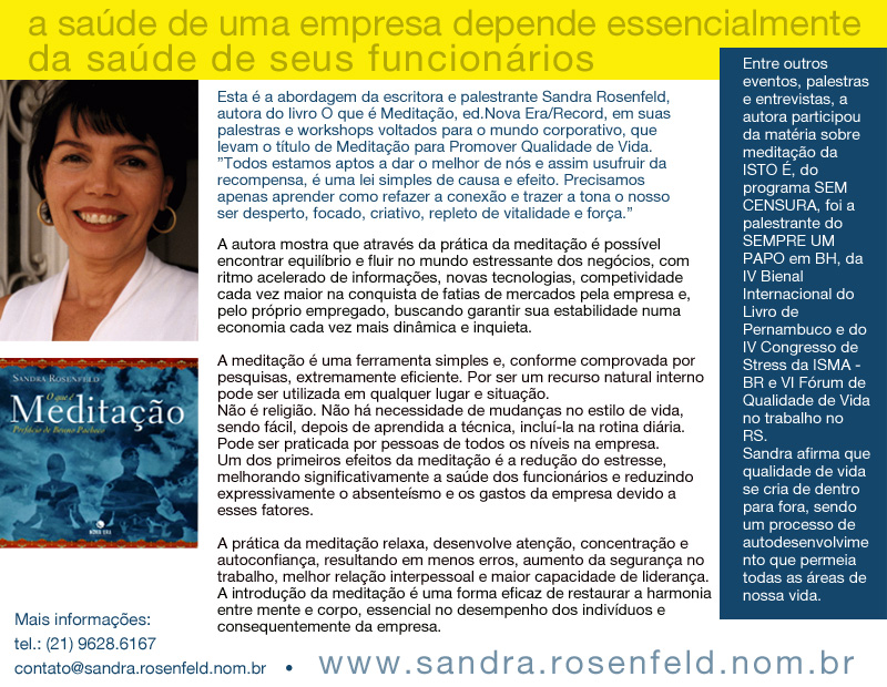 Leia aqui a transcrição da palestra que a autora proferiu no IV Congresso de Stress da ISMA-BR e VI Fórum de Qualidade de Vida no Trabalho. Saiba mais Conseqüências do estresse no ambiente corporativo Estresse, como lidar com ele < Voltar